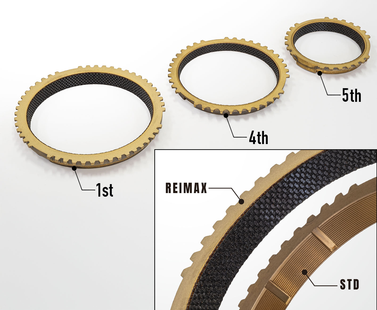 本製品のシンクロには、純正の材質の銅合金に比べて摩擦係数が30%アップとなるカーボン材を採用しています。これにより、常用域から高負荷域までスムーズなギヤチェンジが可能となりました。